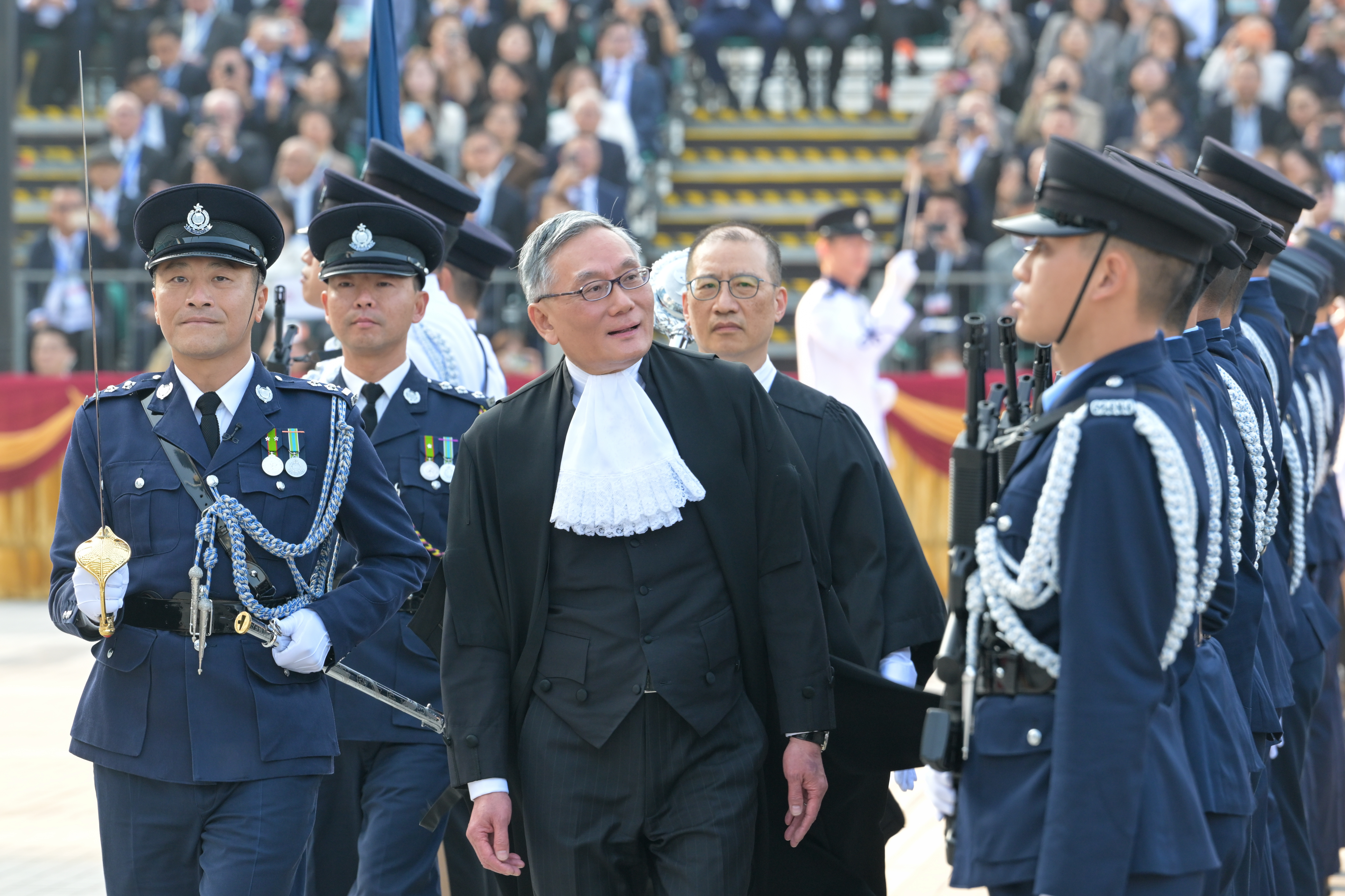 1月19日,香港特区2026年法律年度开启典礼在香港大会堂举行。图为香港特区终审法院首席法官张举能(前排中)在爱丁堡广场检阅香港警察仪仗队。 中新社记者 陈永诺 摄