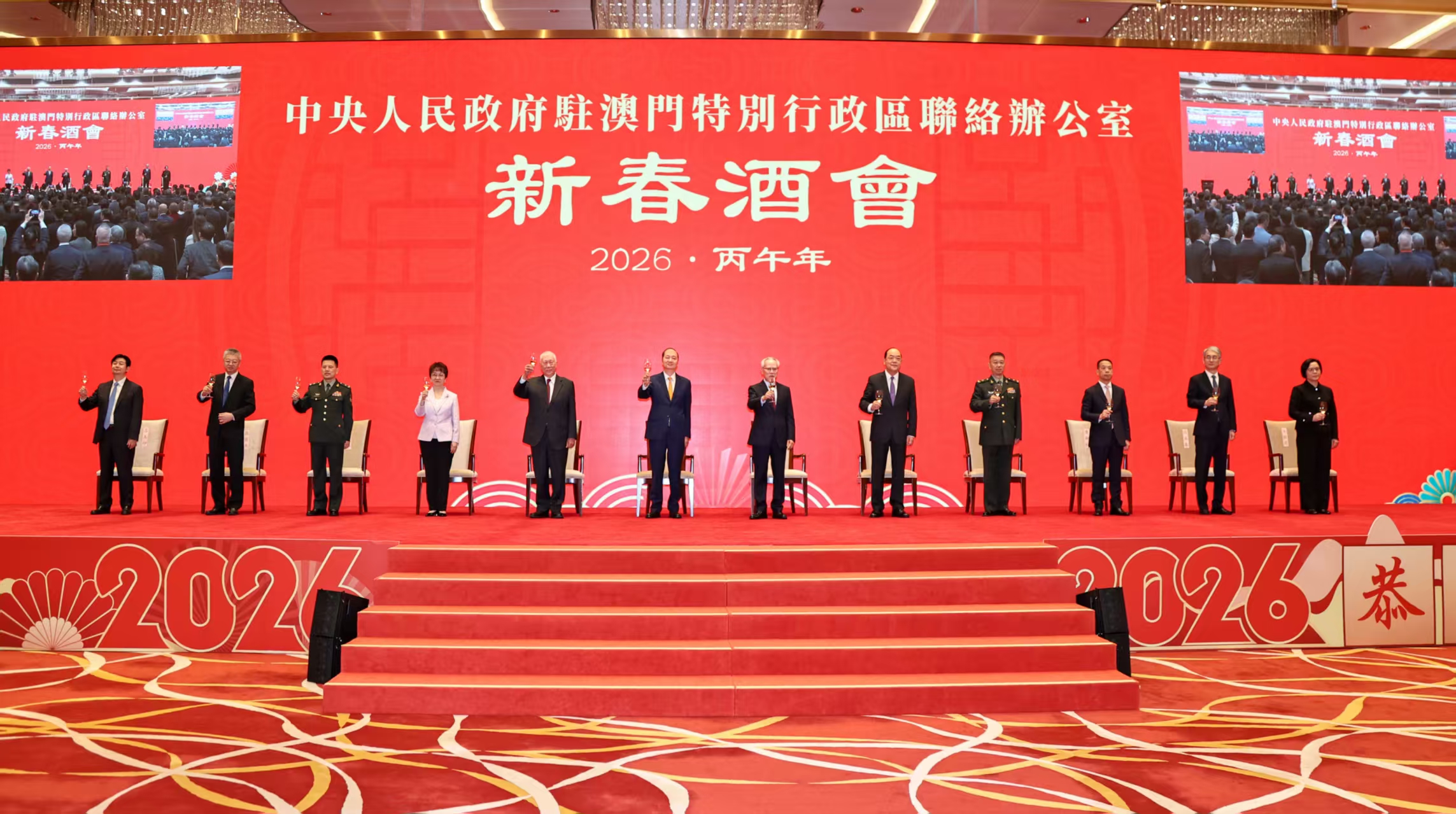 中新社澳门2月5日电(记者 郑嘉伟)中央人民政府驻澳门特别行政区联络办公室(简称“澳门中联办”)5日举办2026年新春酒会。全国政协副主席何厚铧、澳门特区行政长官岑浩辉、澳门中联办主任郑新聪,以及来自中央驻澳机构,澳门特区政府、立法会、司法机构和澳门社会各界等1300余人出席酒会。
