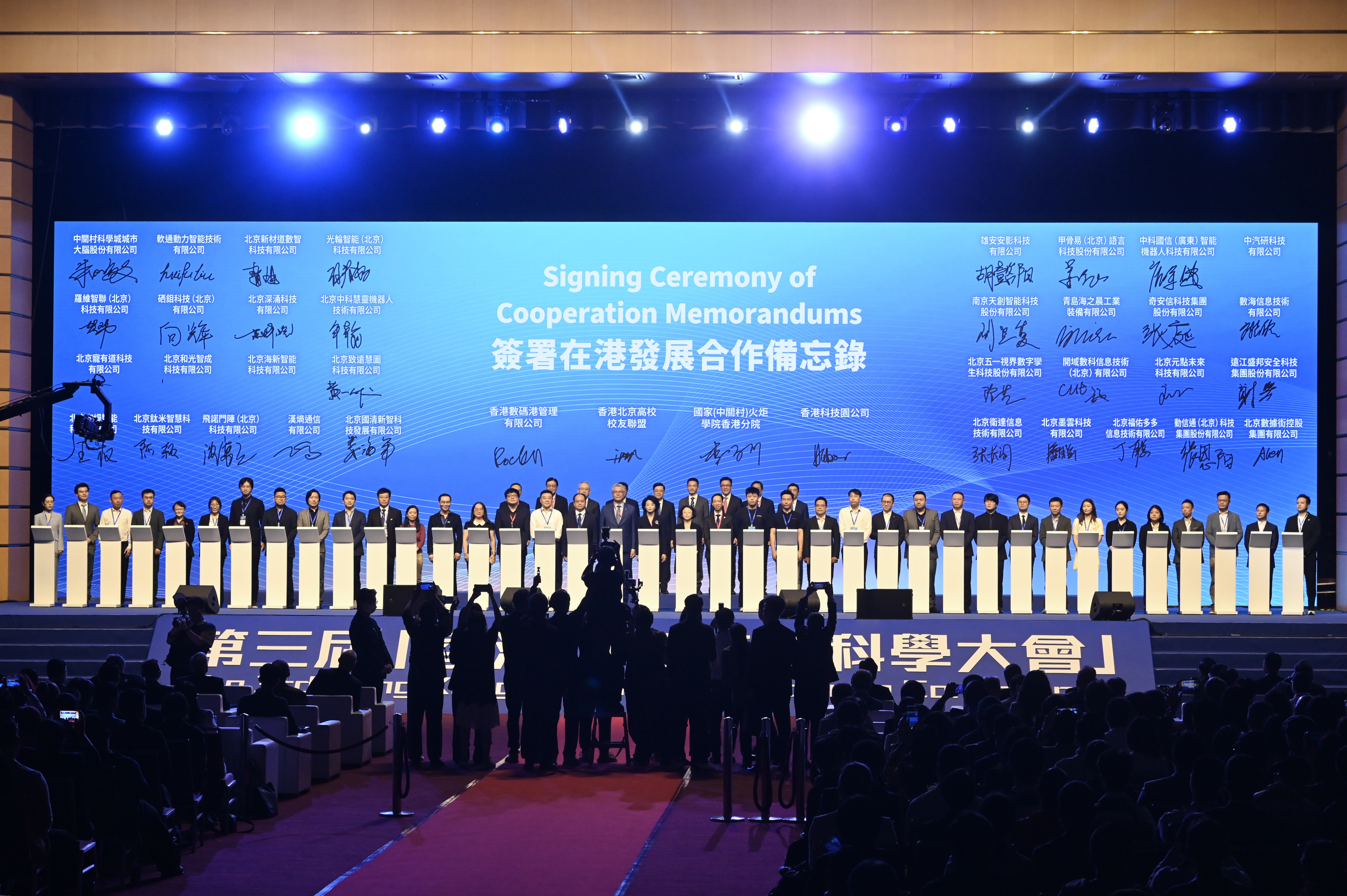4月12日,由香港北京高校校友联盟主办的2026第三届“香港世界青年科学大会”暨“香江诺贝论坛”在香港会议展览中心开幕。图为多位企业代表签署在港发展合作备忘录。 中新社记者 李志华 摄