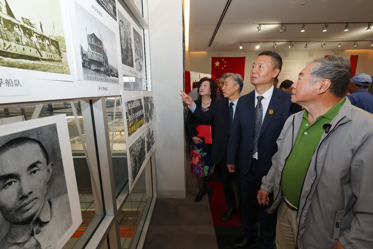 当地时间7月5日,加拿大多伦多,在纪念中国人民抗日战争暨世界反法西斯战争胜利80周年研讨会暨图片展上,中国驻多伦多总领事罗伟东(右二)与侨界代表共同观看抗战资料图片。中新社记者 余瑞冬 摄