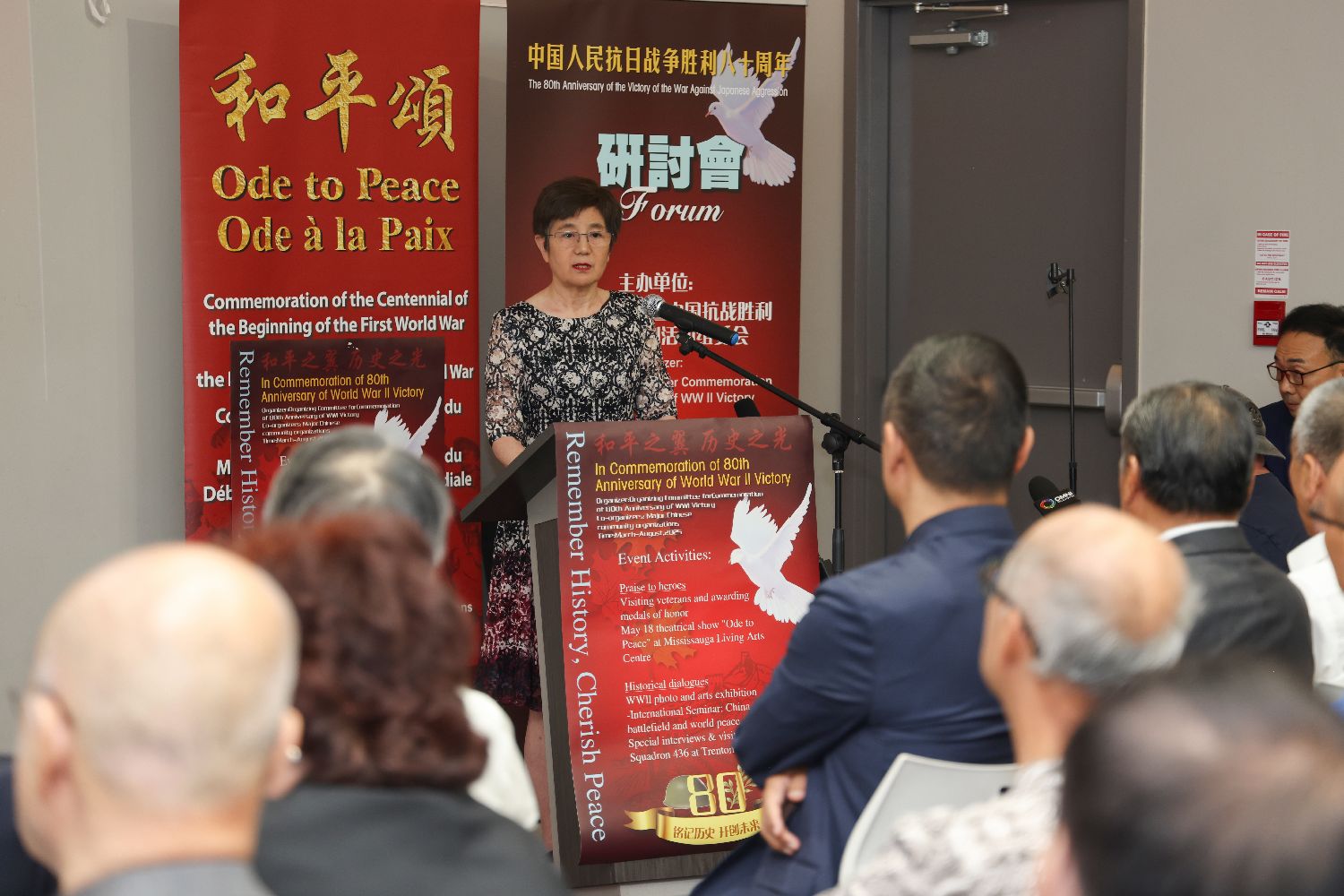 出席活动的中国驻多伦多总领事罗伟东在致辞时向长期以来在海外宣传中国抗战伟大事迹、弘扬正确二战史观的侨胞表达敬意,并表示,纪念抗战胜利不是为了延续仇恨,而是要铭记历史、缅怀先烈、珍爱和平、开创未来。他特别指出,今年也是台湾光复80周年。一个中国原则不容挑战,二战胜利成果不容篡改;希望领区侨胞继续秉持民族大义,以实际行动积极推进反“独”促统进程。