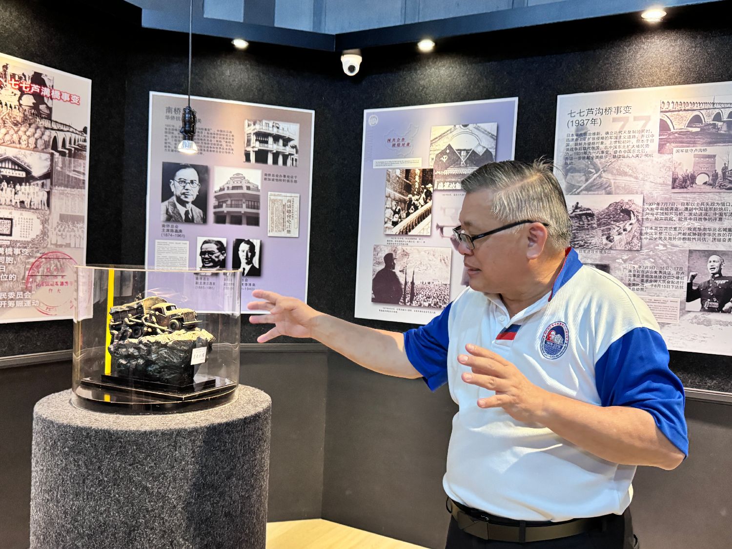 10月13日,陈全坤向游客讲解南侨机工驾驶货车的雕塑模型。洪沂 摄