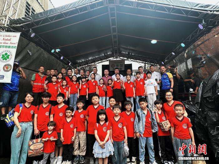 当地时间12月13日,巴西圣保罗一平民社区,中巴慈善基金总会、巴西青田慈善总会、中巴射击协会、巴西金华商会同乡总会、巴西华人华侨羽毛球协会联袂做慈善捐赠活动现场,参与歌舞表演的小侨胞们合影。中巴慈善基金总会供图