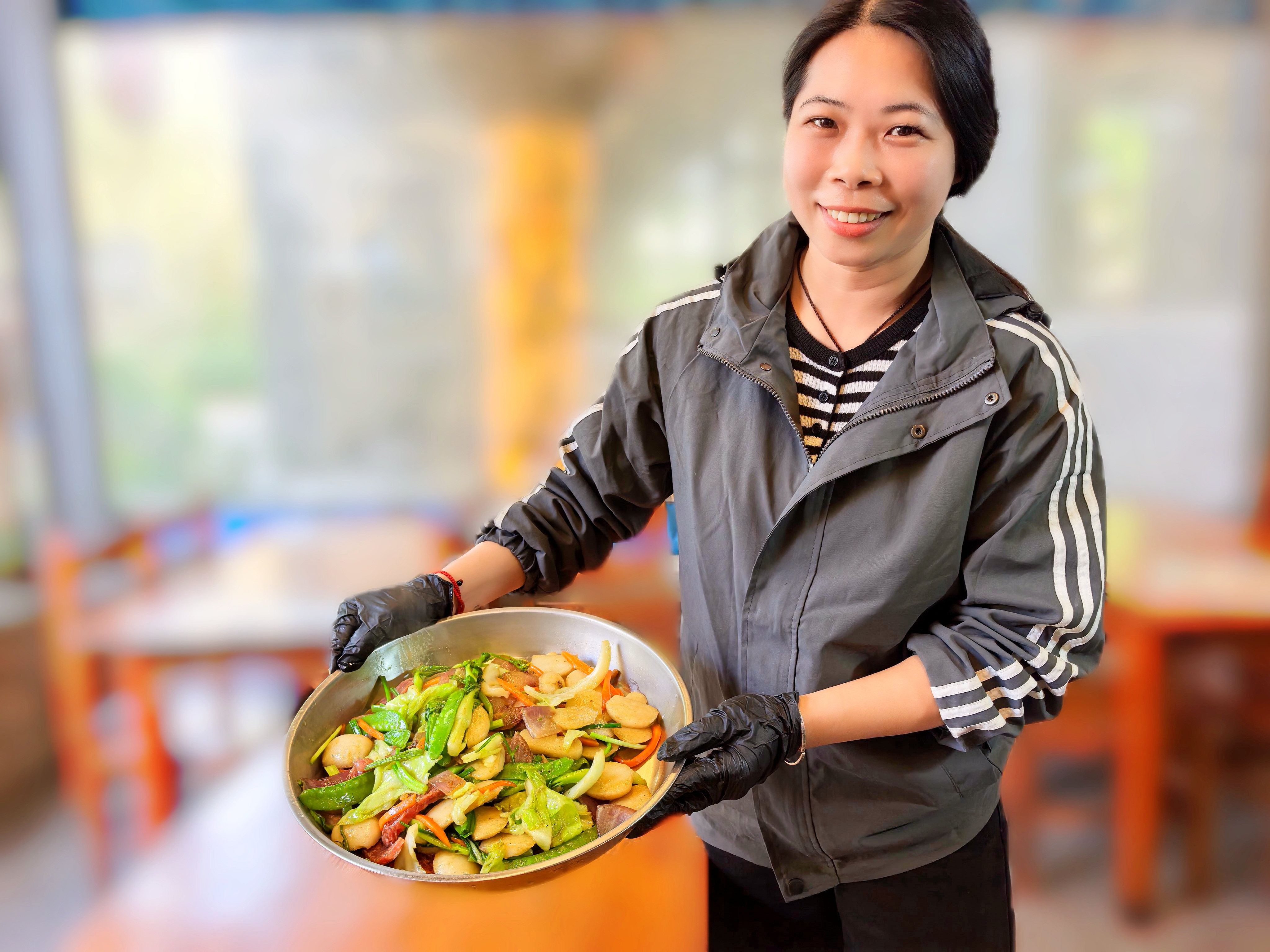 2月5日,广东台山水步镇草坪村“三嫂茶点”负责人林女士展示腊味炒牛栏圆菜式。李晓春 摄