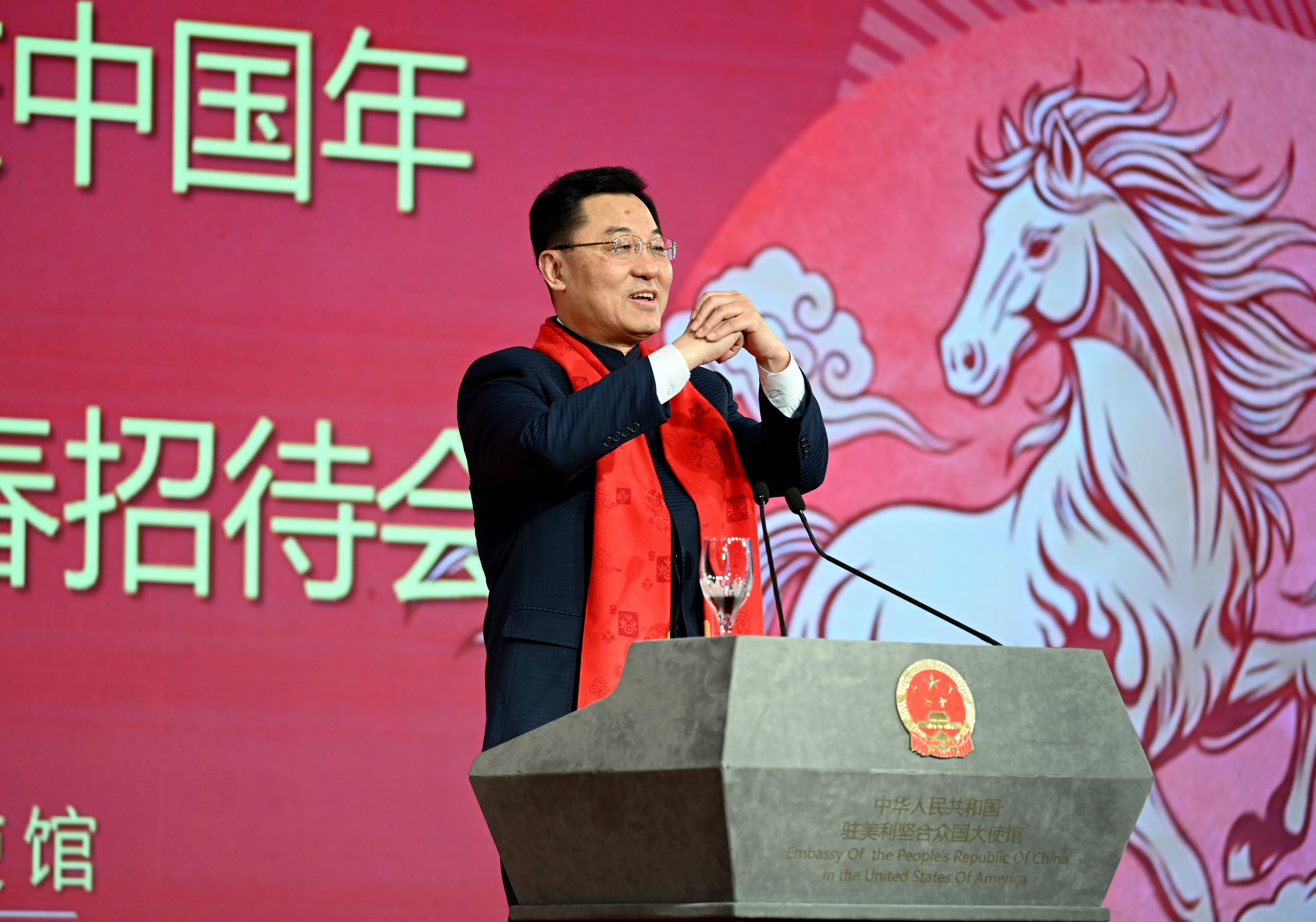当地时间2月6日,华盛顿,中国驻美大使馆举办“温暖迎春·共庆中国年”侨学界专场新春招待会。图为中国驻美大使谢锋致辞。中新社记者 陈孟统 摄