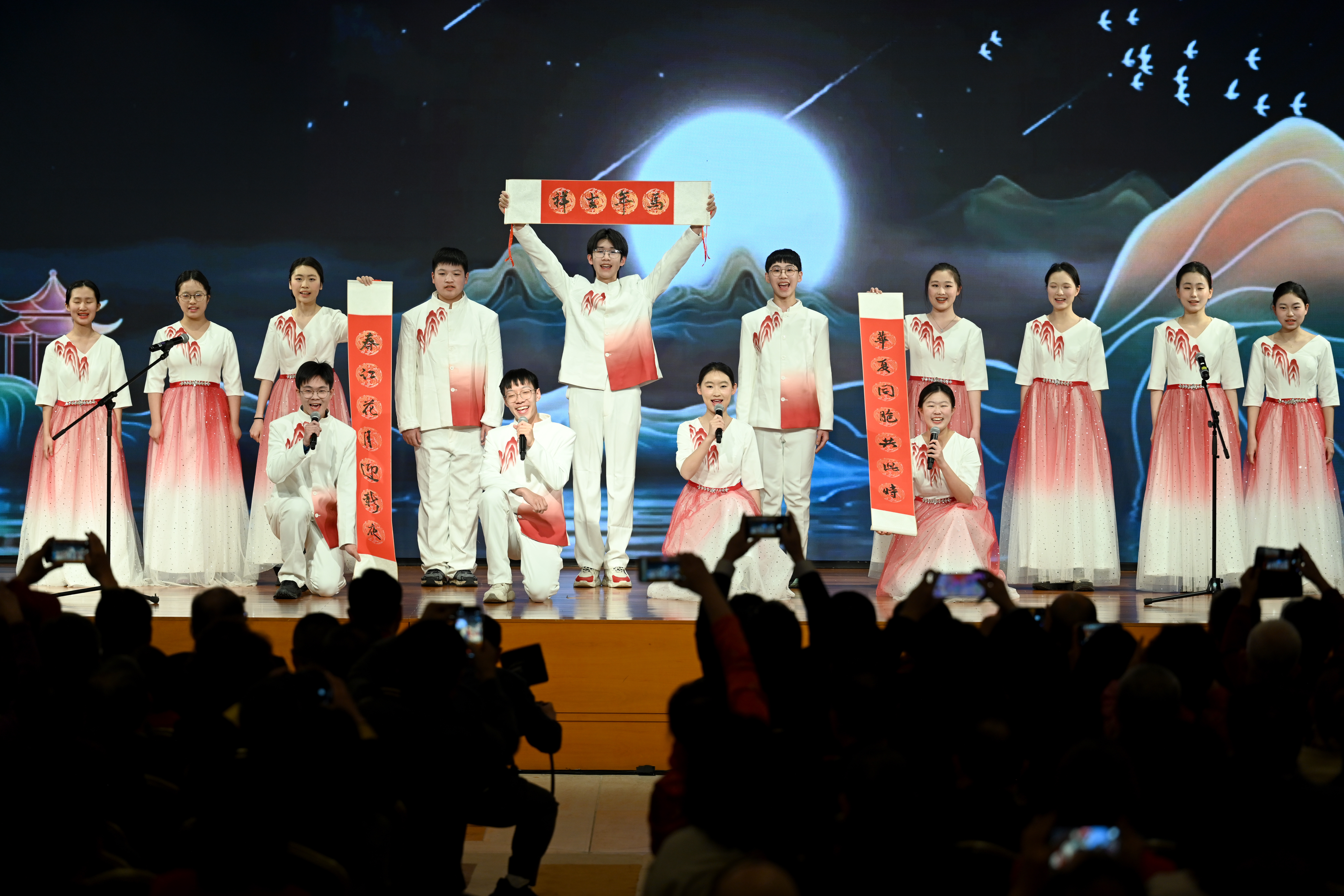 当地时间2月6日,华盛顿,中国驻美大使馆举办“温暖迎春·共庆中国年”侨学界专场新春招待会。图为赴美参访的上海市卢湾高级中学学生代表表演诗朗诵。中新社记者 陈孟统 摄