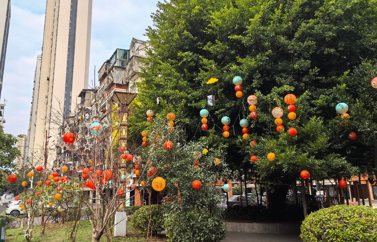 夜幕降临,华侨新村社区的路灯次第亮起,东南亚风情的挂饰与红灯笼随风摇曳。社区活动室里,舞蹈队的队员们正在排练新节目;几位老人坐在廊下闲聊,分享各自制作的东南亚糕点,年味在此氤氲升腾。