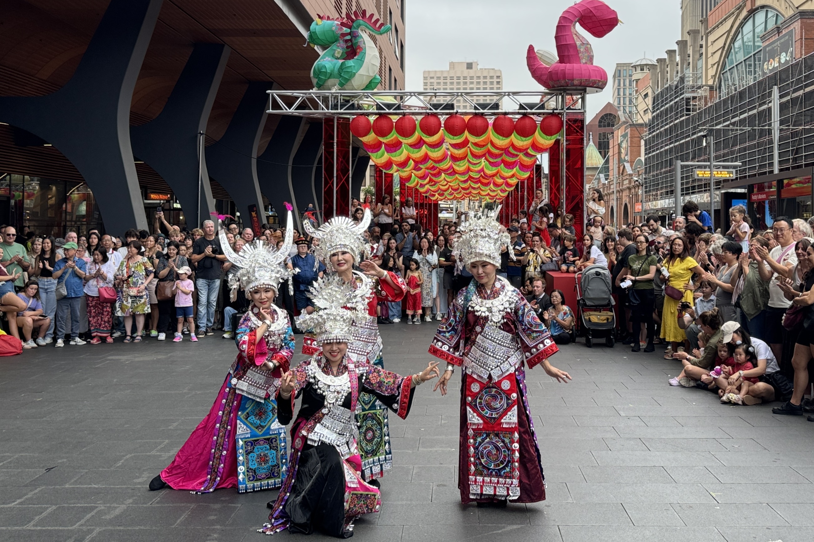 2月21日,悉尼市中心户外广场上,悉尼华星艺术团成员带来民族歌舞表演,吸引众多当地民众驻足观看。(受访者供图)