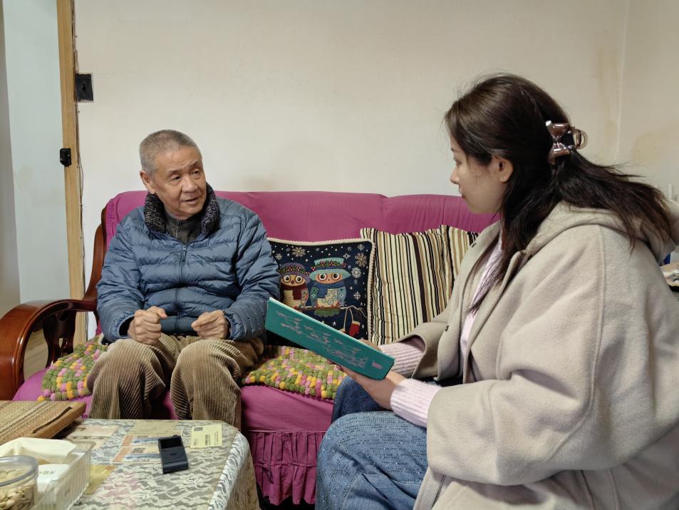 近日,侨眷王弘毅在上海市普陀区的家中与新侨范卓然(右)讲述家族往事。 范宇斌 摄