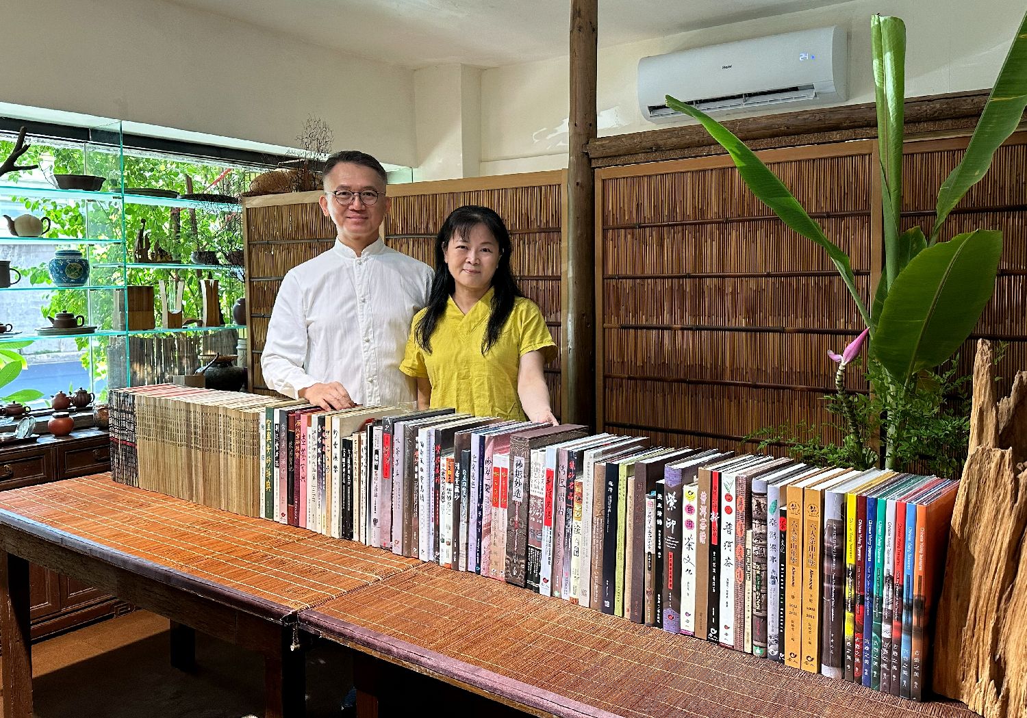 夫妇二人的工作室紧邻台北市知名假日花市,店名“唐人茶艺”,屋内摆满明清至当代的各式茶壶。关于装修风格,黄健亮采纳了儿子的建议。“原来认知这是一间出版社,但他更倾向布置成茶艺空间。”