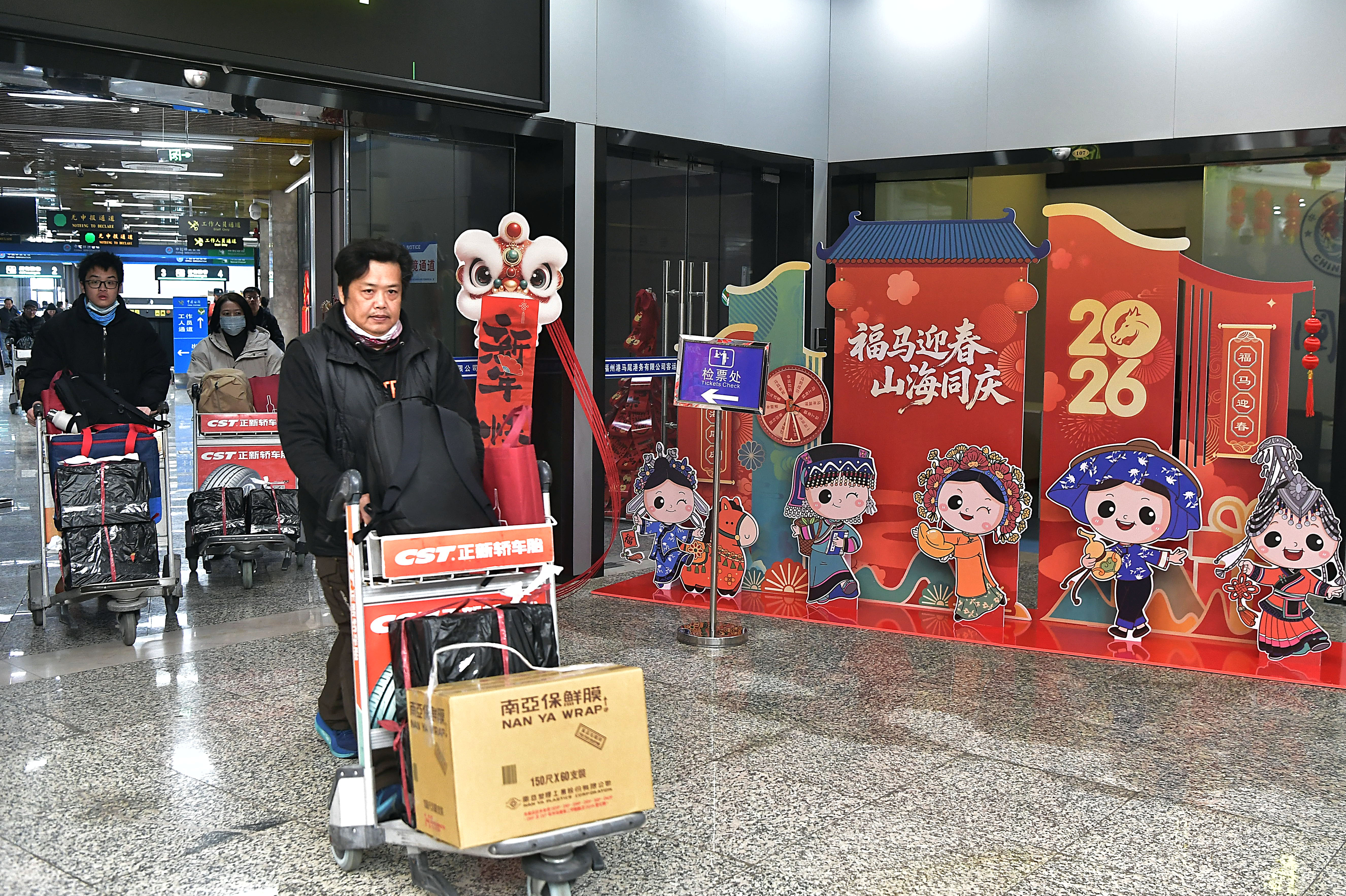 福州港黄岐客运站内,旅客们大多扶老携幼、举家出行,正推着行李车有序排队等待通关。红灯笼、中国结、对联、“福”字等新年装饰随处可见。