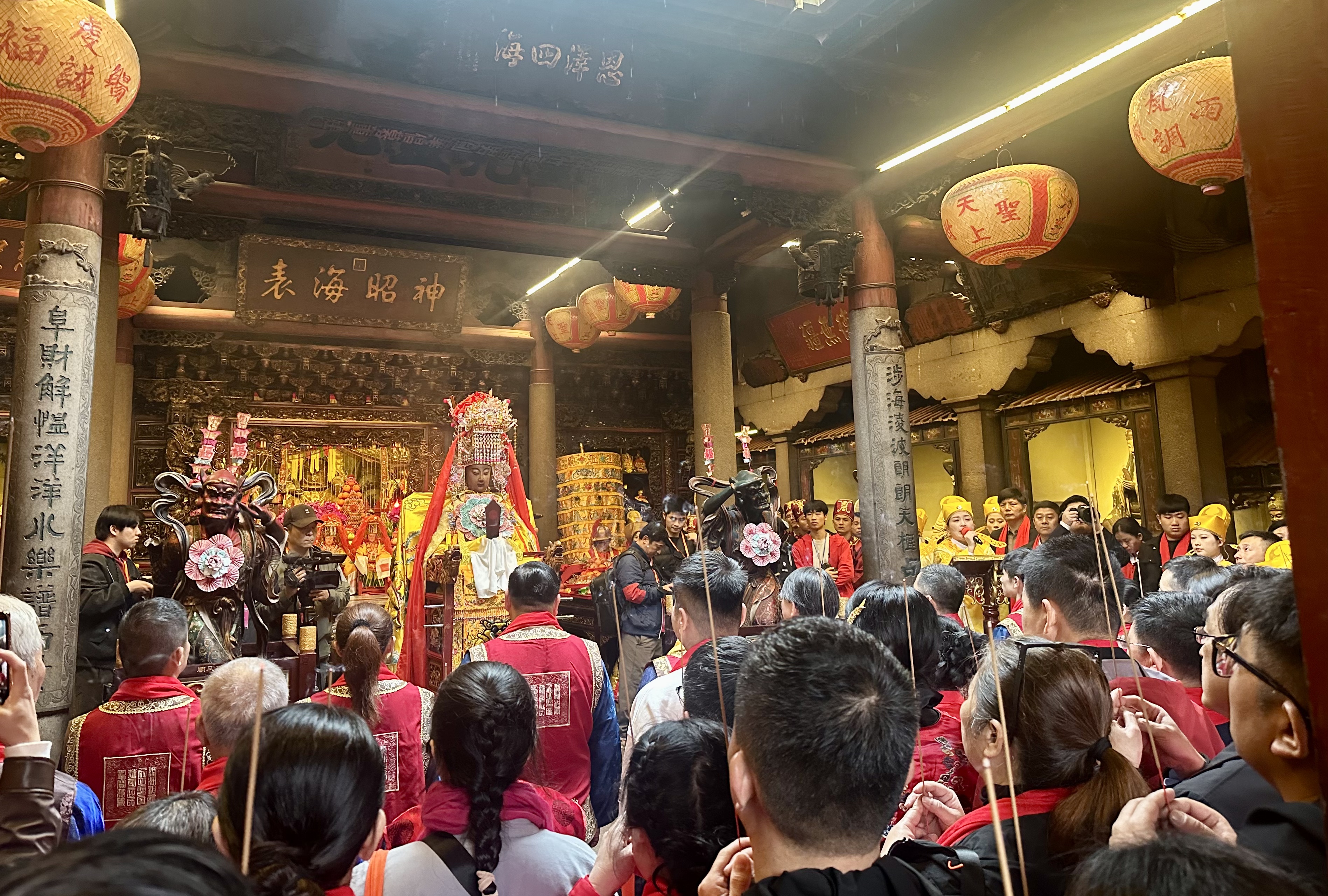 当日9时58分,湄洲妈祖祖庙内锣鼓铿锵、人潮如织,气氛庄重而热烈。两岸妈祖信众共同参与妈祖金身起驾仪式,行三献礼,恭请妈祖金身起驾出巡。