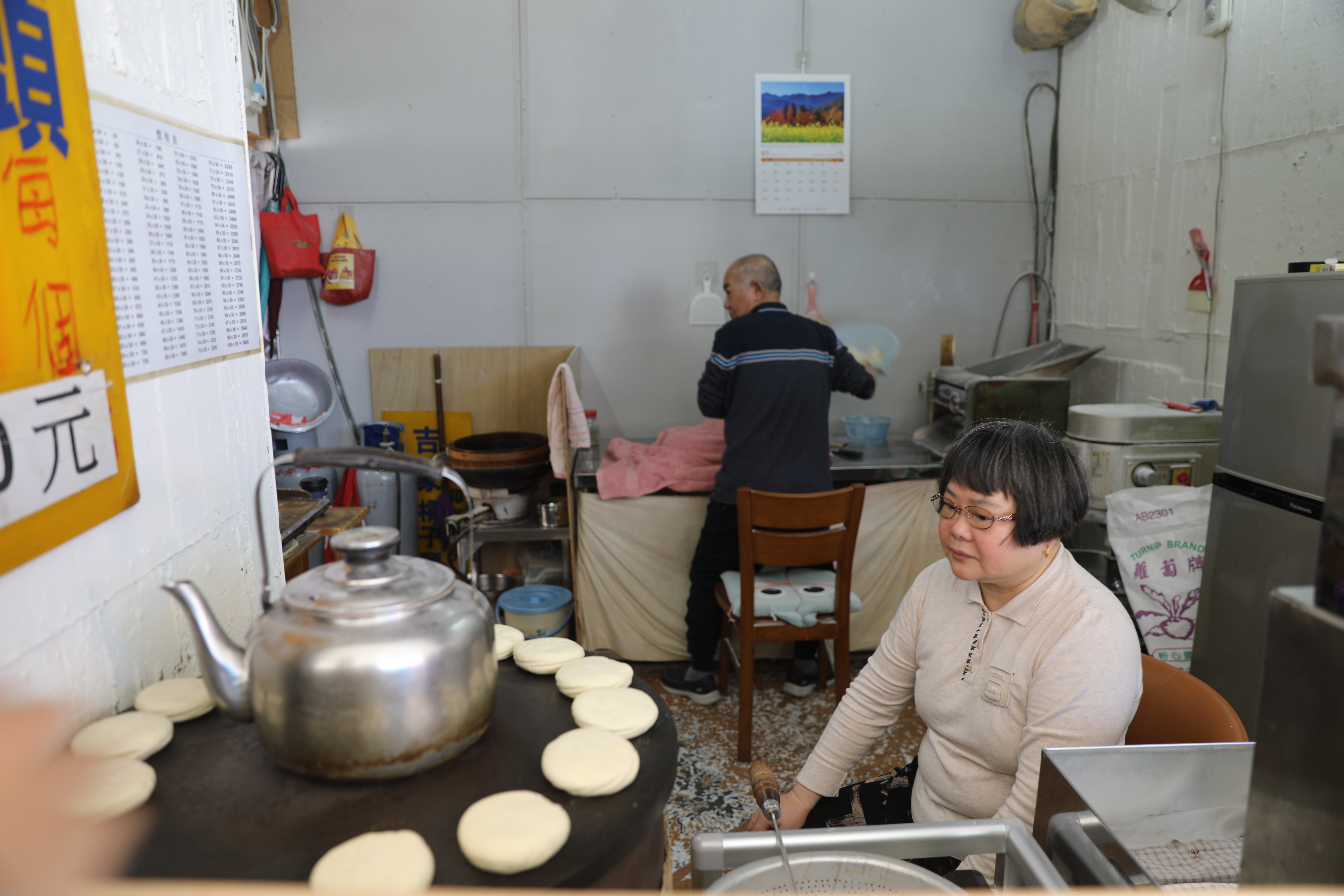 中新社台北3月19日电(中新社记者 刘大炜)在台北南昌路二段的骑楼下有一家不起眼的小店,店内飘出阵阵面粉焦香。店门口烤炉边,58岁的方新梅戴着隔热手套翻动火炉内一圈金黄色的面饼;几步之外,她的丈夫吉廷武在案板上揉好面团后,分成大小一致的剂子。