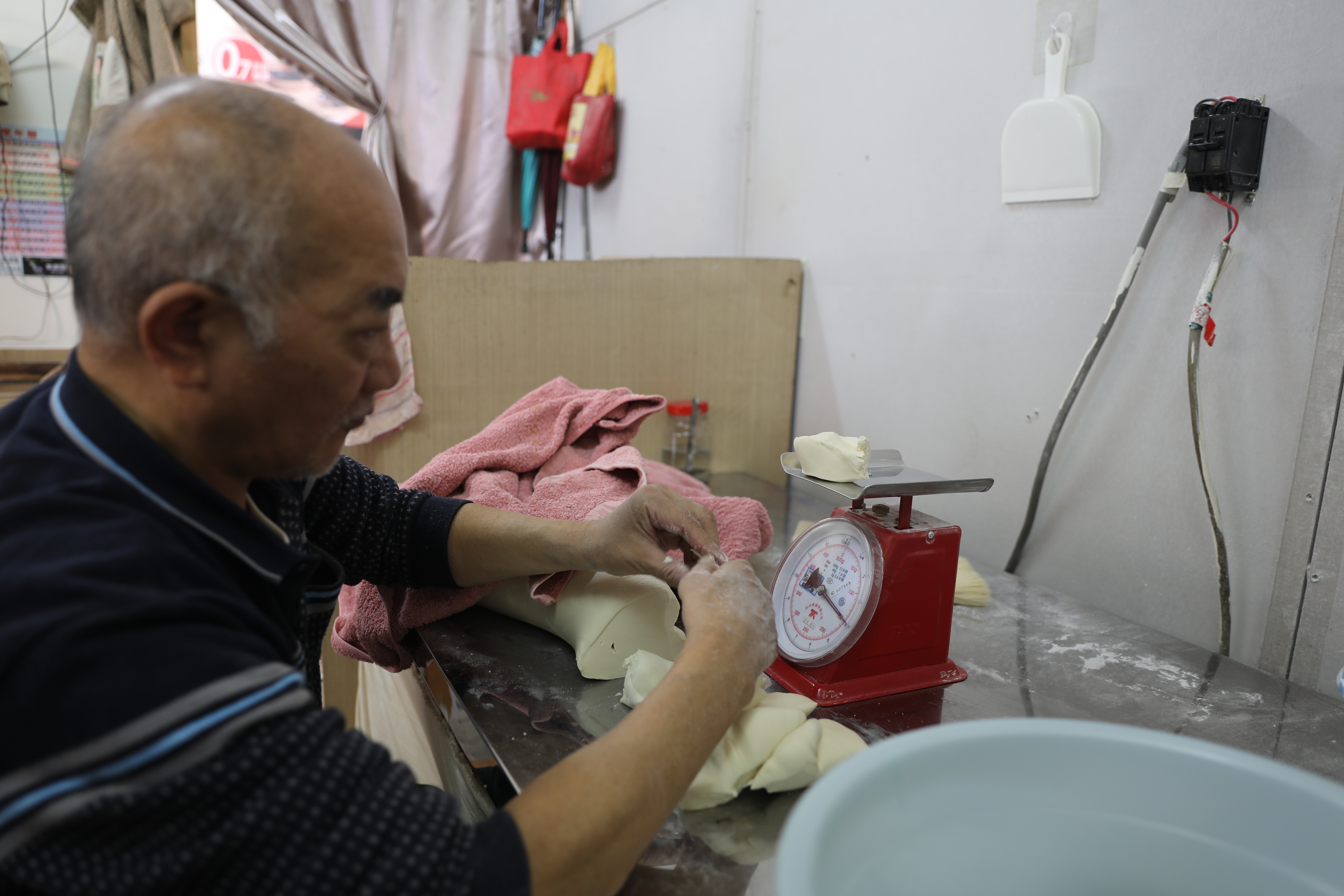 3月16日,位于台北南昌路二段的吉家火烧店,今年63岁的吉廷武将面团分成大小一致的剂子。中新社记者 刘大炜 摄
