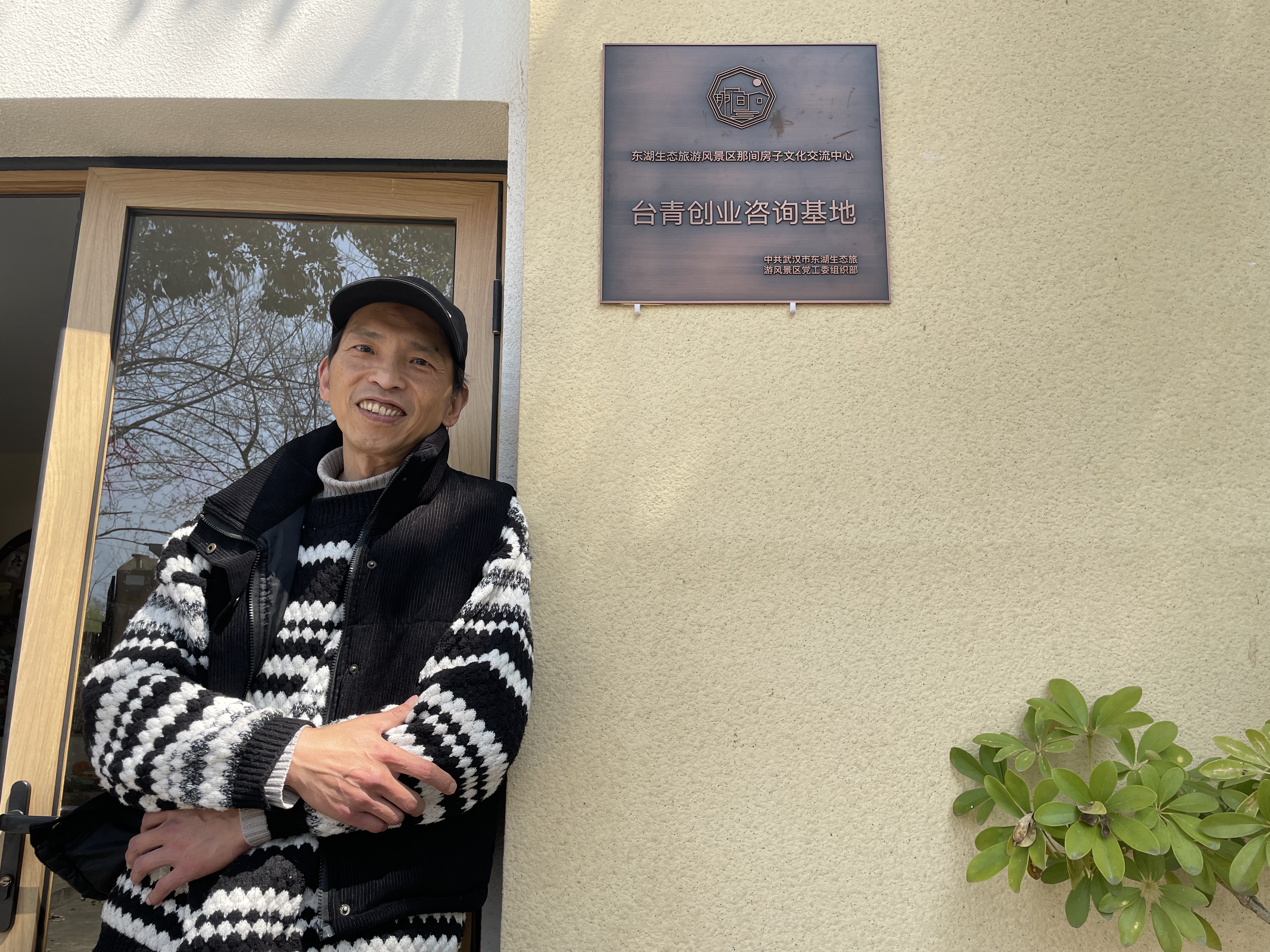 3月12日,徐志宏站在“那间房子”民宿门外,墙上挂着“台青创业咨询基地”牌匾。 中新社记者 马芙蓉 摄